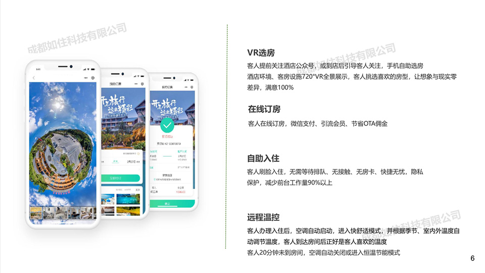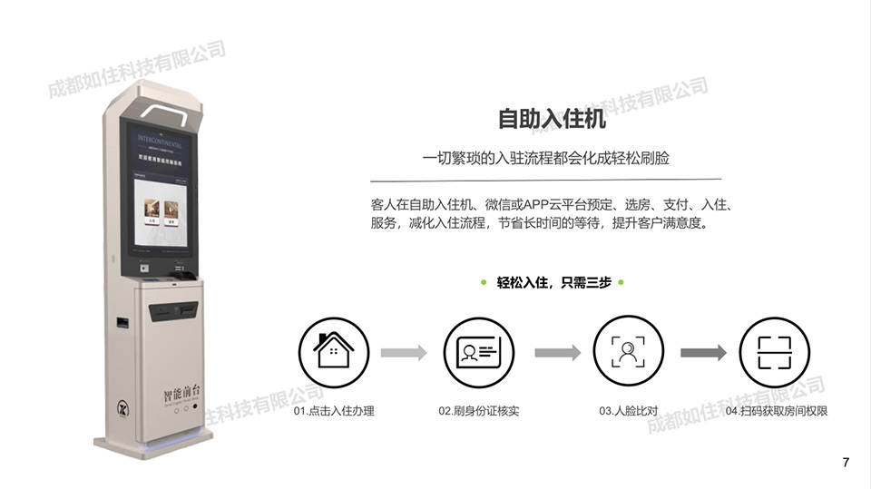 入住前: 通过微信小程序完成预定、选房 ,酒店的自助入住机可以帮助客人快捷办理入住手续,由智能机器人进行线路引导,让吸客、预定、登记、无卡开门等一切繁琐的入住流程变得如此简单。
