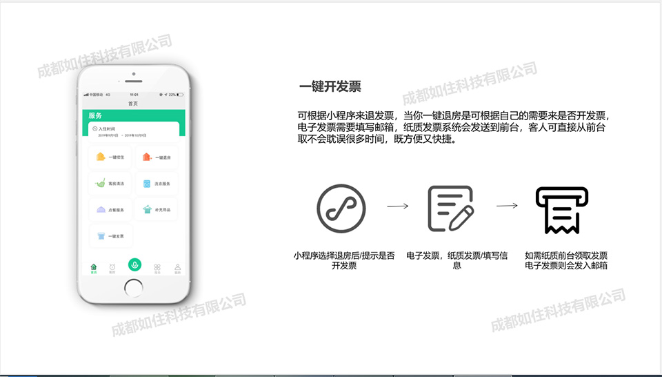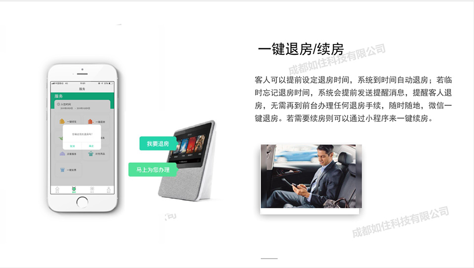 入住后:  客人可以提前设定退房时间,系统到时间自动退房;若临时忘记退房时间,系统会提前发送提醒消息,提醒客人退房,无需再到前台办理任何退房手续,随时随地,微信一键退房。当一键退房时可根据自己的需要选择是否开发票,电子发票直接发送到邮箱,纸质发票则将开票信息发送到前台,客人可直接从前台获取准备好的发票而不会耽误很多时间,既方便又省时。